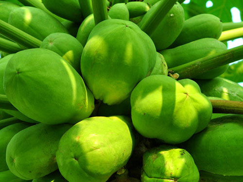 番木瓜(學(xué)名:Carica papayaL.)是番木瓜科、番木瓜屬植物。常綠軟木質(zhì)小喬木,高達可達10米,具乳汁;葉大,聚生于莖頂端,近盾形,葉柄中空,花單性或兩性,植株有雄株,雄花:排列成圓錐花序,下垂;花無梗;萼片基部連合;花冠乳黃色,冠管細管狀,雌花:單生或由數(shù)朵排列成傘房花序,著生葉腋內(nèi),花冠裂片分離,